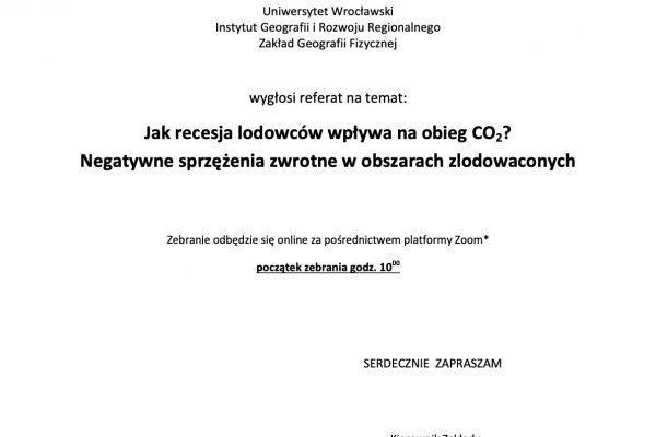 W dniu 20.11.2020 r. o godzinie 10:00 odbędzie się referat dr. Łukasza Stachnika (Uniwersytet Wrocławski), zatytułowany “Jak recesja lodowców wpływa na obieg CO2? Negatywne sprzężenia zwrotne w obszarach zlodowaconych”, w ramach zebrania Zakładu Zasobów Środowiska i Geozagrożeń Instytutu Geografii i Przestrzennego Zagospodarowania PAN. Wiadomość z prośbą o dane do logowania na zebranie należy przesłać na adres: […]